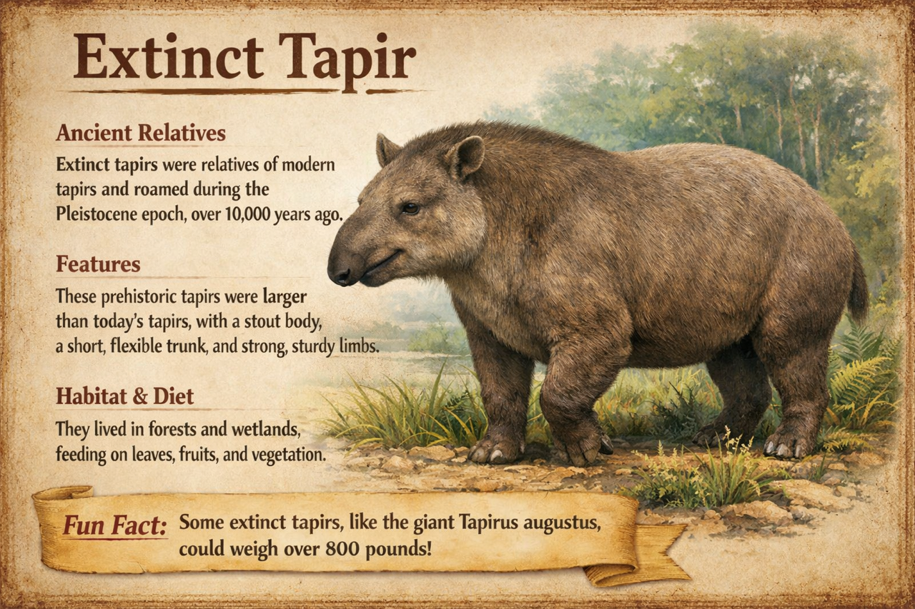 Tapirs are herbivorous mammals related to horses and rhinoceroses, known for their sturdy bodies and short trunk-like snouts. While tapirs still live in parts of Central and South America today, several species once lived in North America and eventually became extinct thousands of years ago. Their teeth were specially adapted for grinding plants, leaves, and vegetation from the lush environments they inhabited.