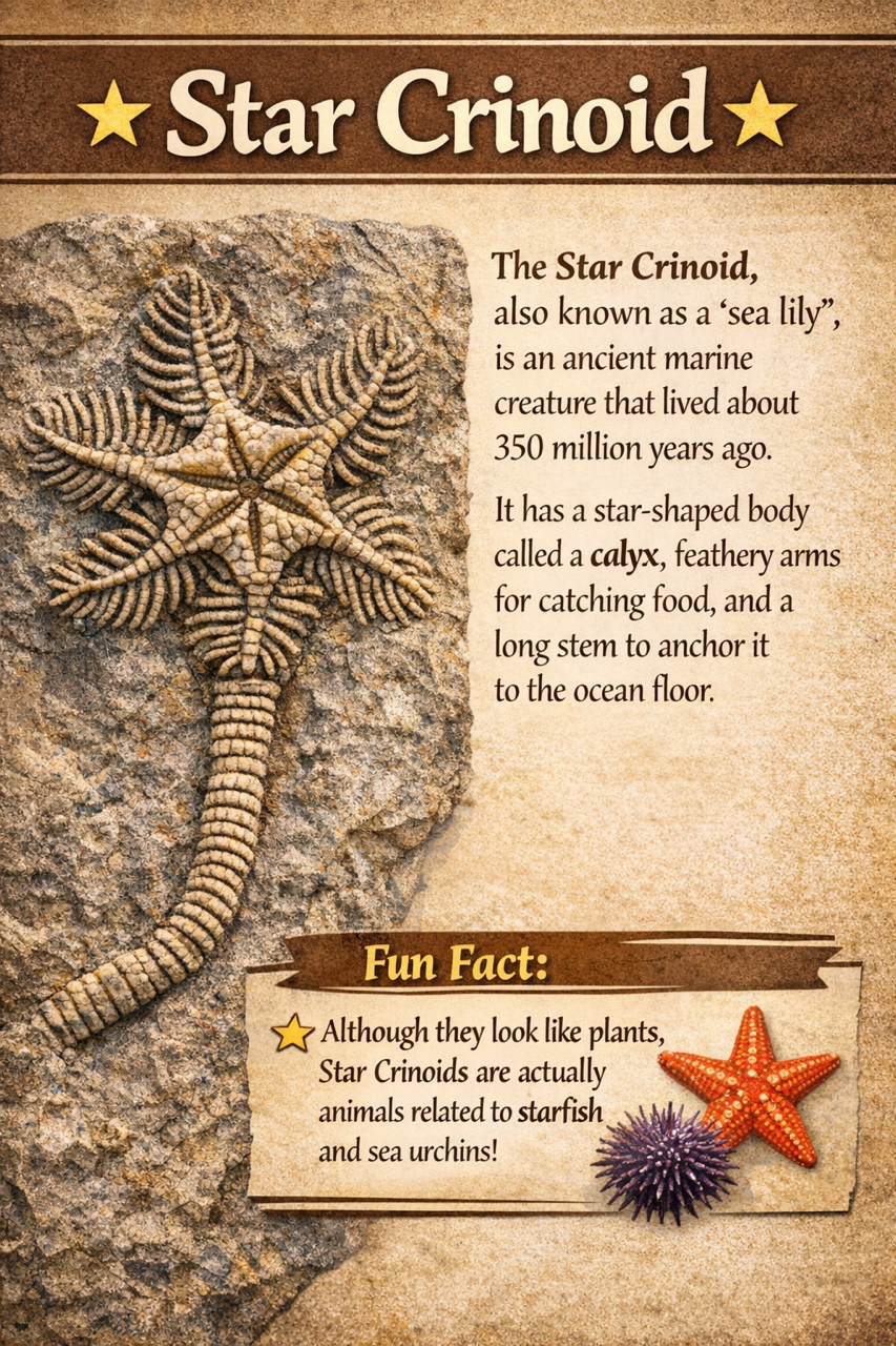 Crinoids, often called “sea lilies,” are marine animals related to modern sea stars and feather stars. They lived attached to the sea floor by long stems, waving feathery arms through the water to filter food. The stems were made of small stacked segments, and some rare varieties formed natural star-shaped patterns, which is how these unique fossils earned the name star crinoids.