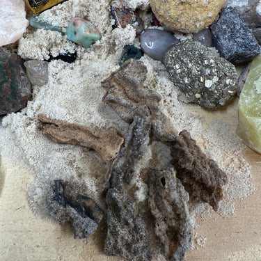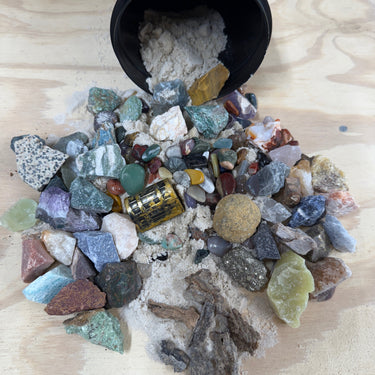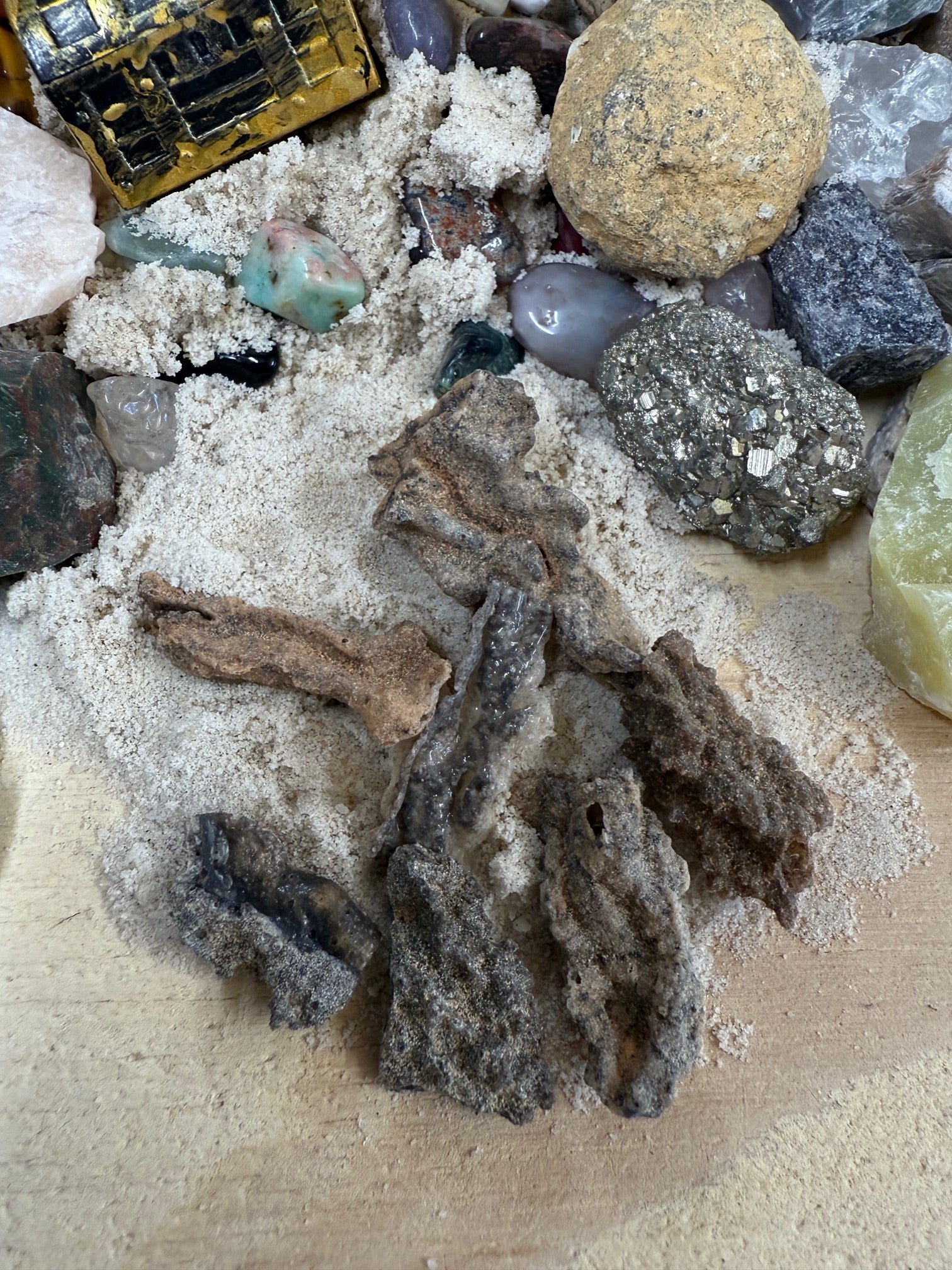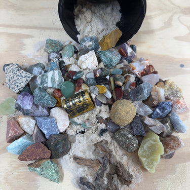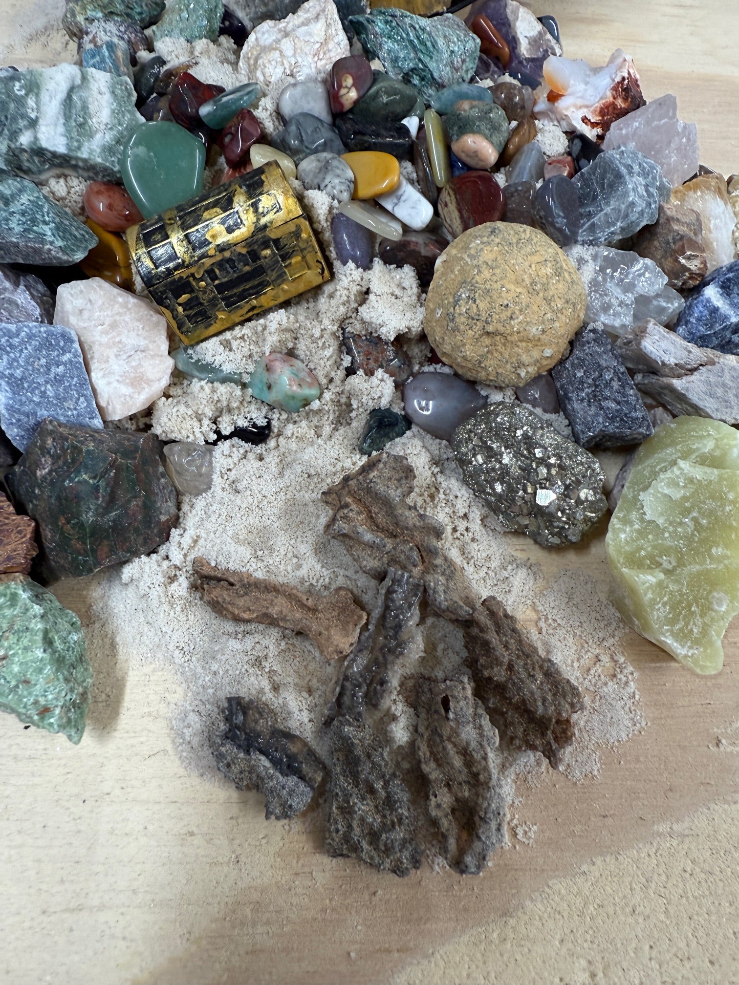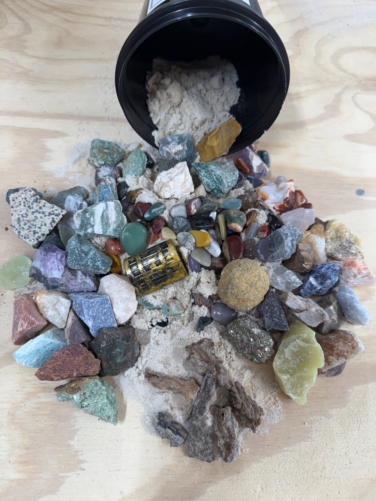 The quart Mini Miner Lightning Strike. This bucket contains an assortment of small raw stones, 1 piece of authentic fulgurite [ also known as fossilized lightning ], crackable geode and buried treasure. all packed in our gem-fetti sand, which is clean filtered play sand with lots of tiny tumbled stones.