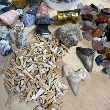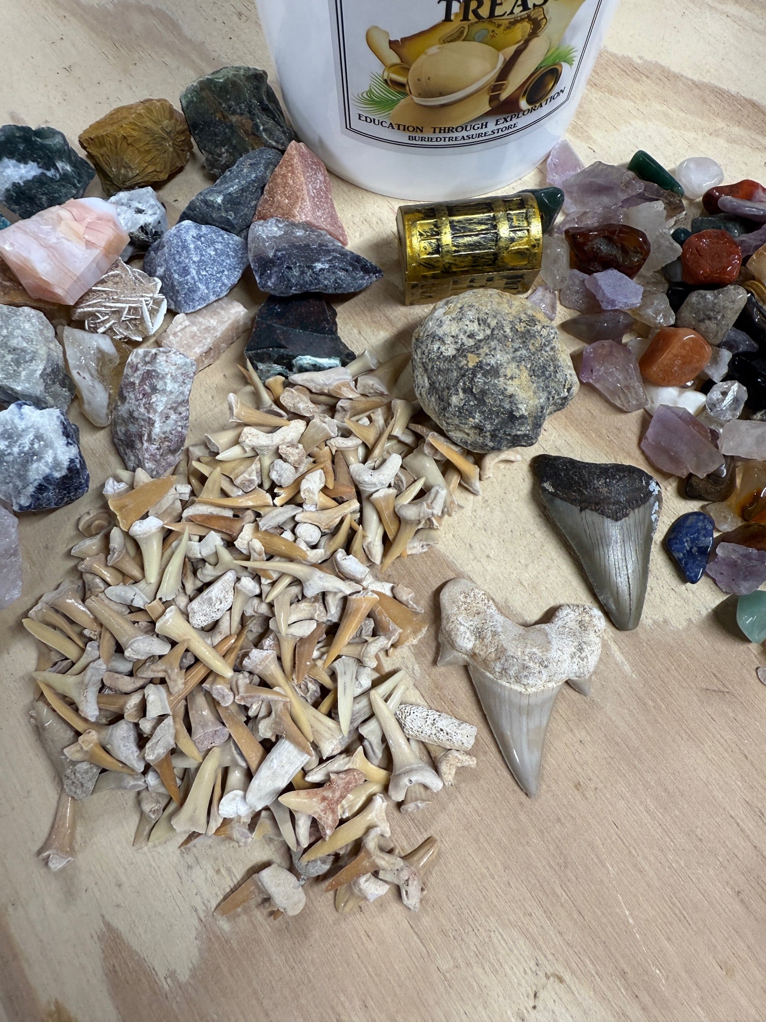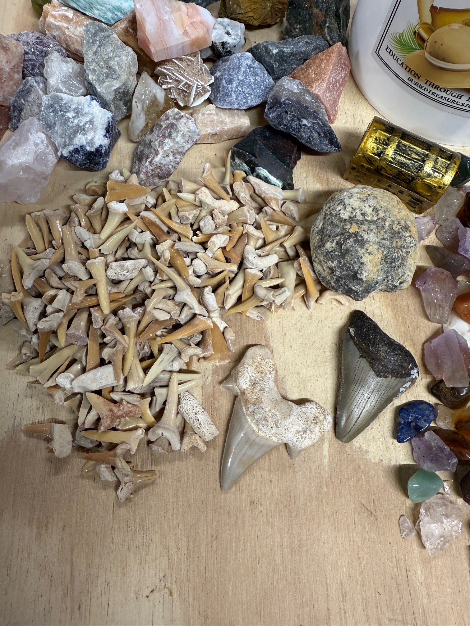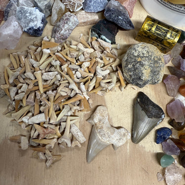- Material: Natural crystal raw stones, fossils, fossil otodus, Atlantic Ocean fossil frag, crackable geode, and buried treasure. π