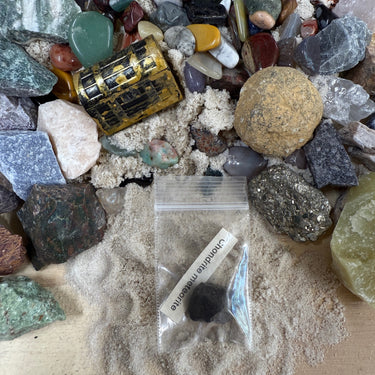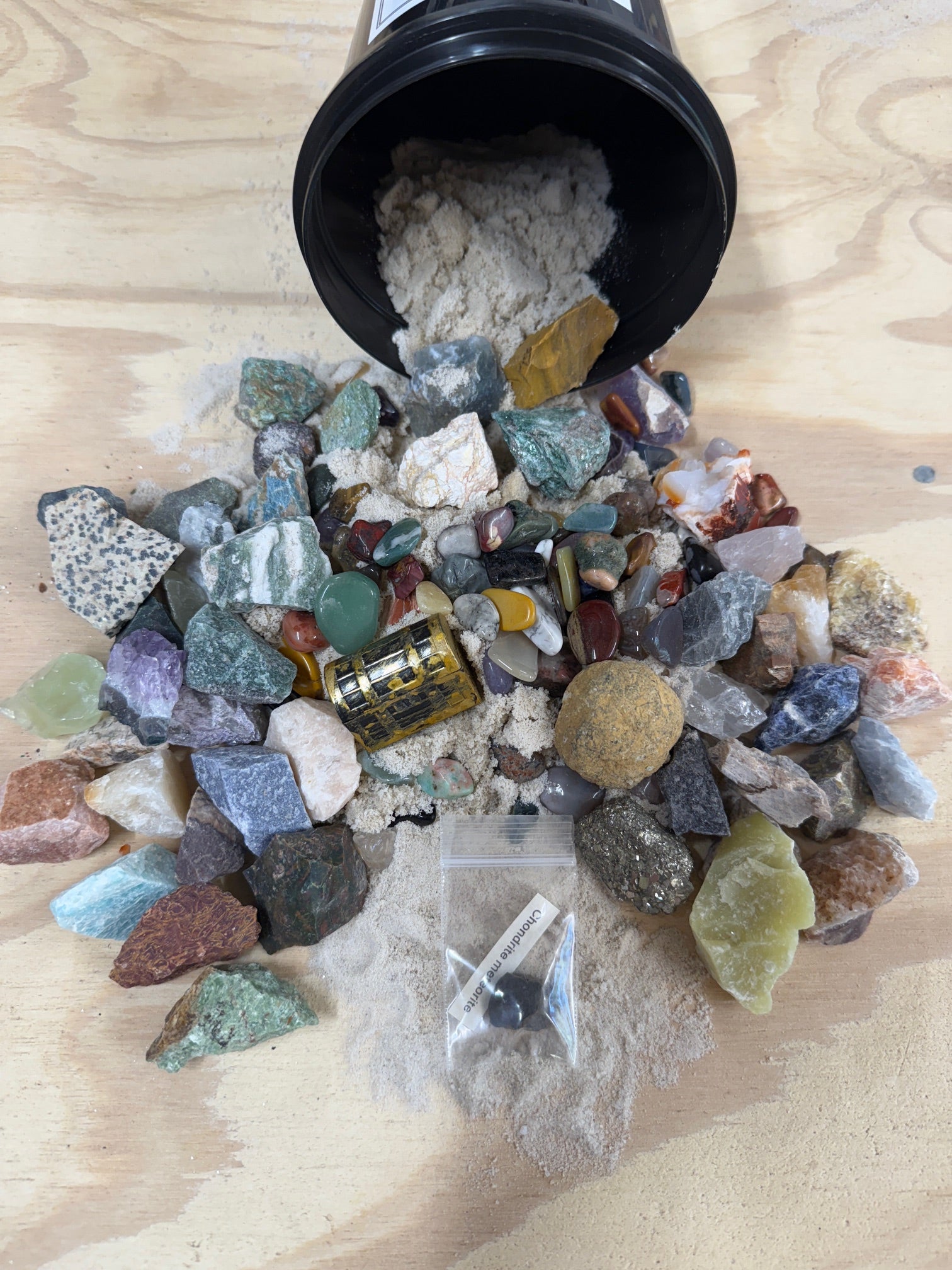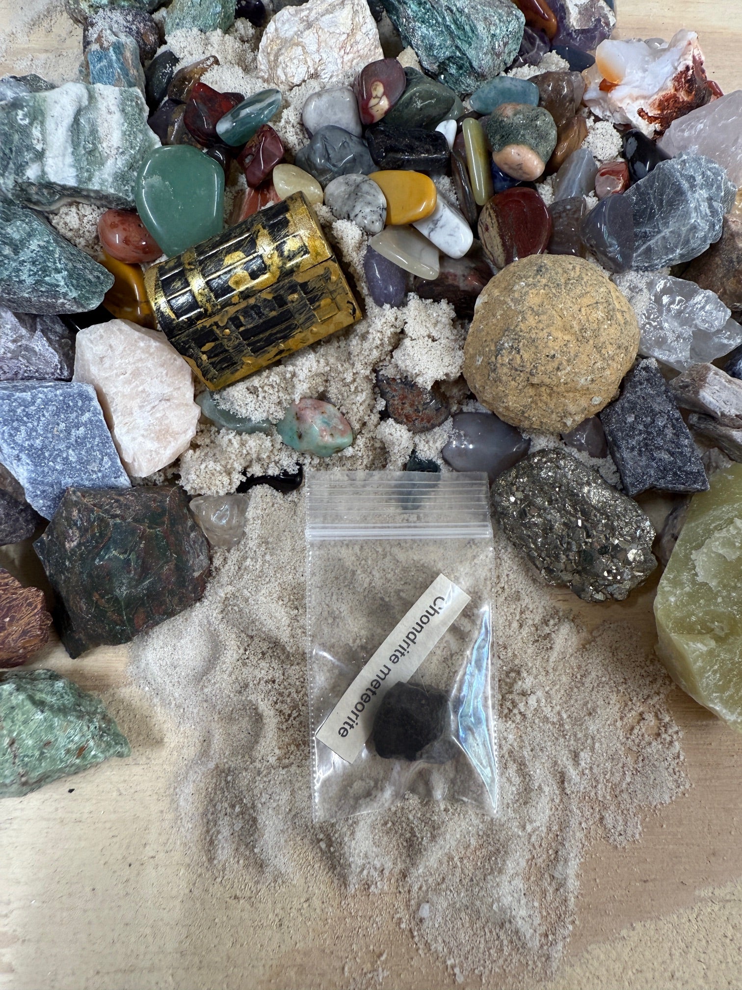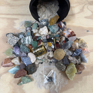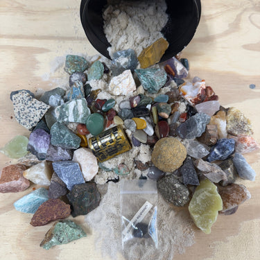 • Gem-fetti Sand: All items are packed in clean, filtered play sand with lots of small tumbled stones.