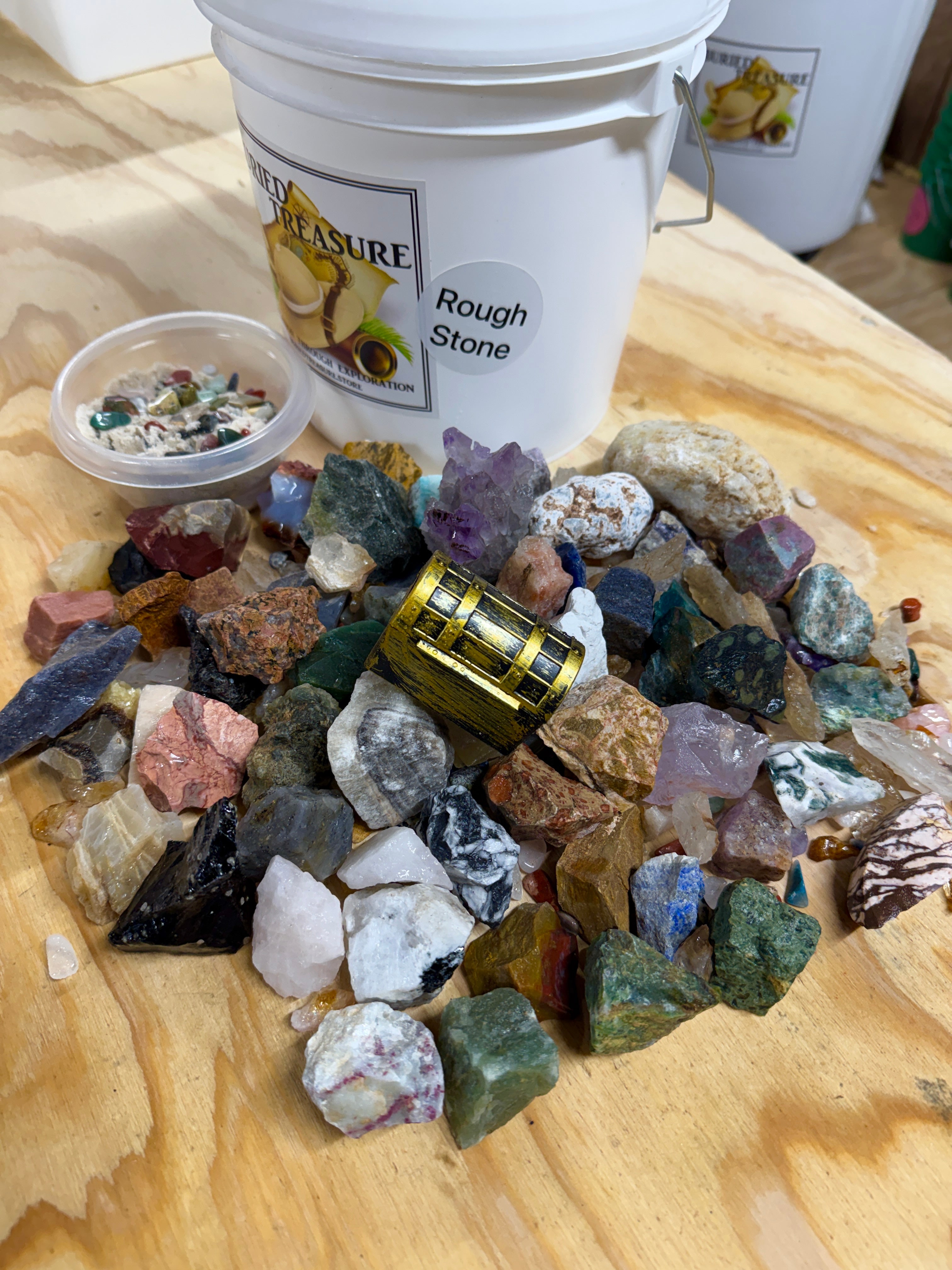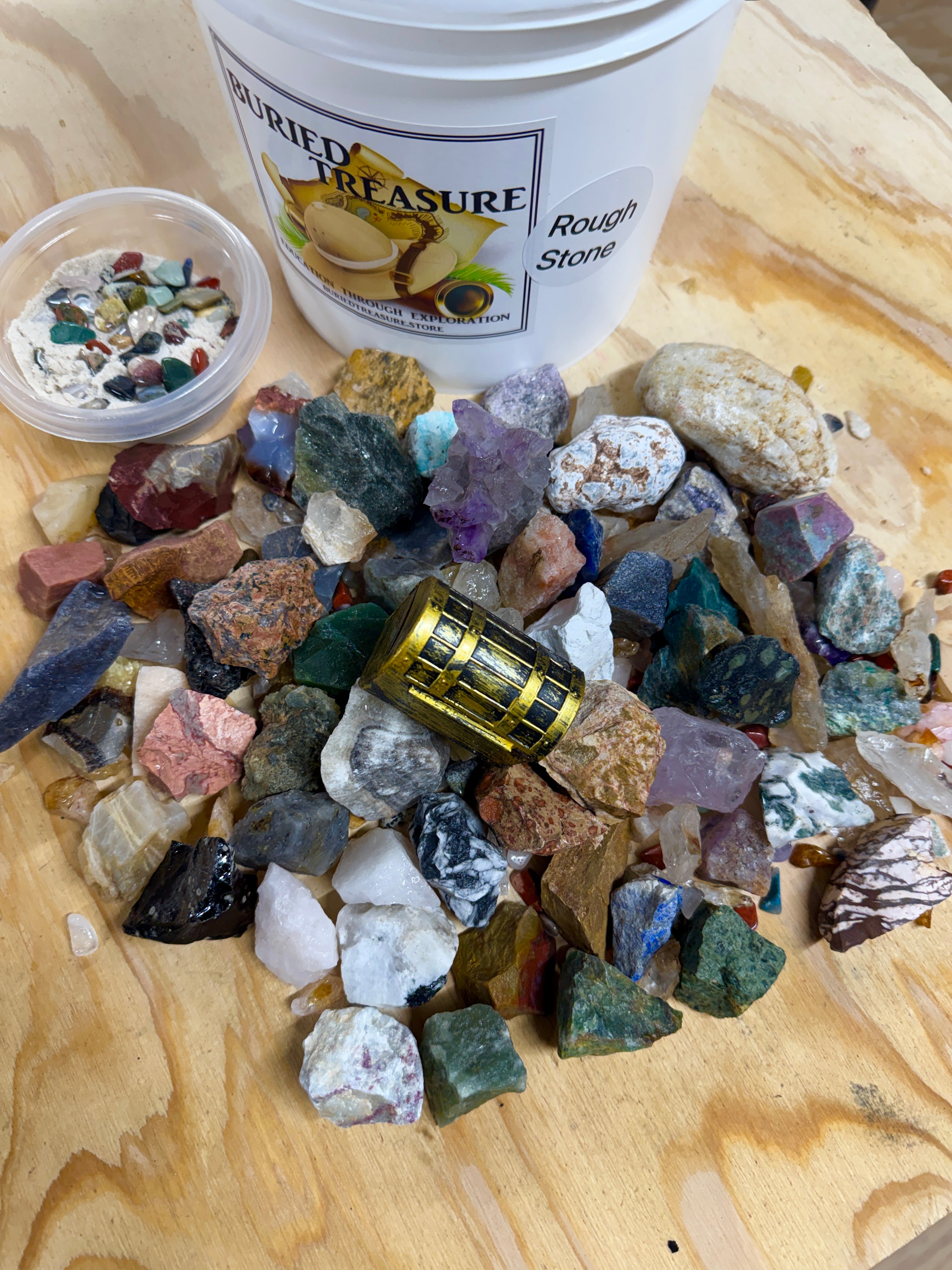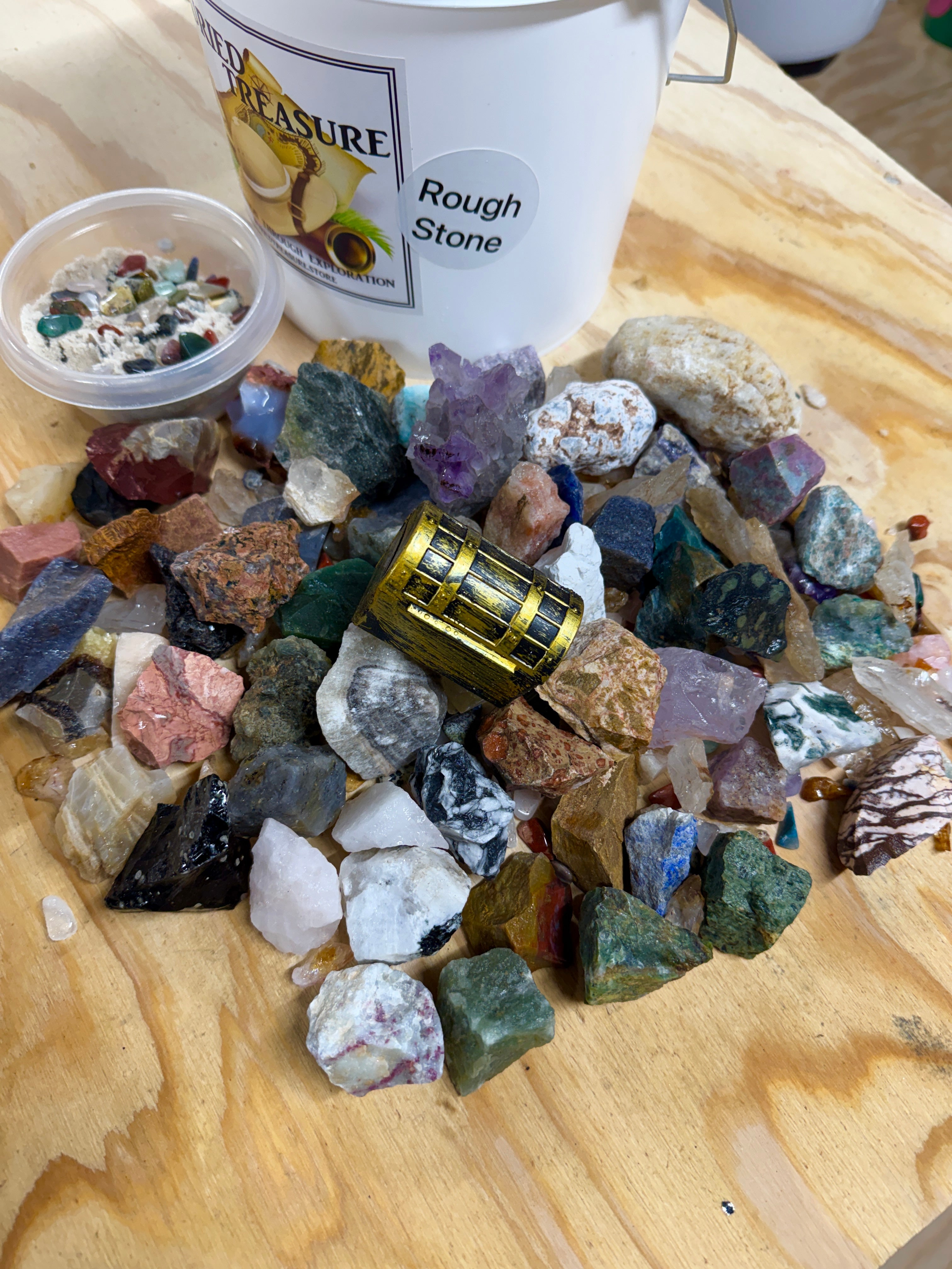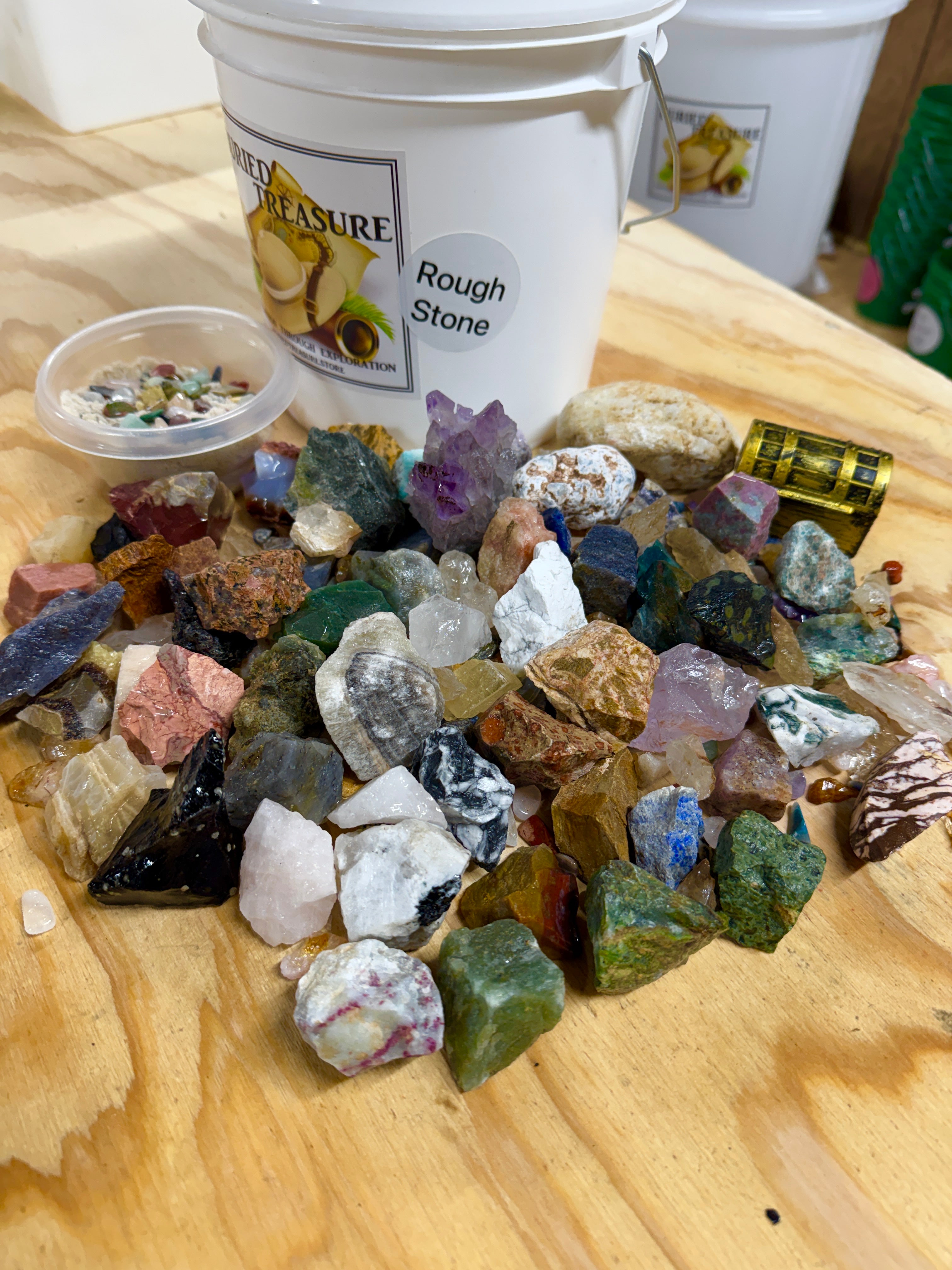 Experience 14 pounds of mining fun with our 1 gallon Rough Stone Mining Bucket. We now fill our buckets with at least one of each stone off our table, between 45 and 55 different rough stones in every bucket, over 5 lbs. Each bucket also comes with a crackable geode and buried treasure. Uncover rare gems and minerals from around the world. Each bucket also comes with our gemfetti sand. Our gemfetti sand is washed and sifted sand that is littered with small tumbled stones. Perfect for hours off screen time, parties, family fun, learning, the aspiring geologist or gem collector.
