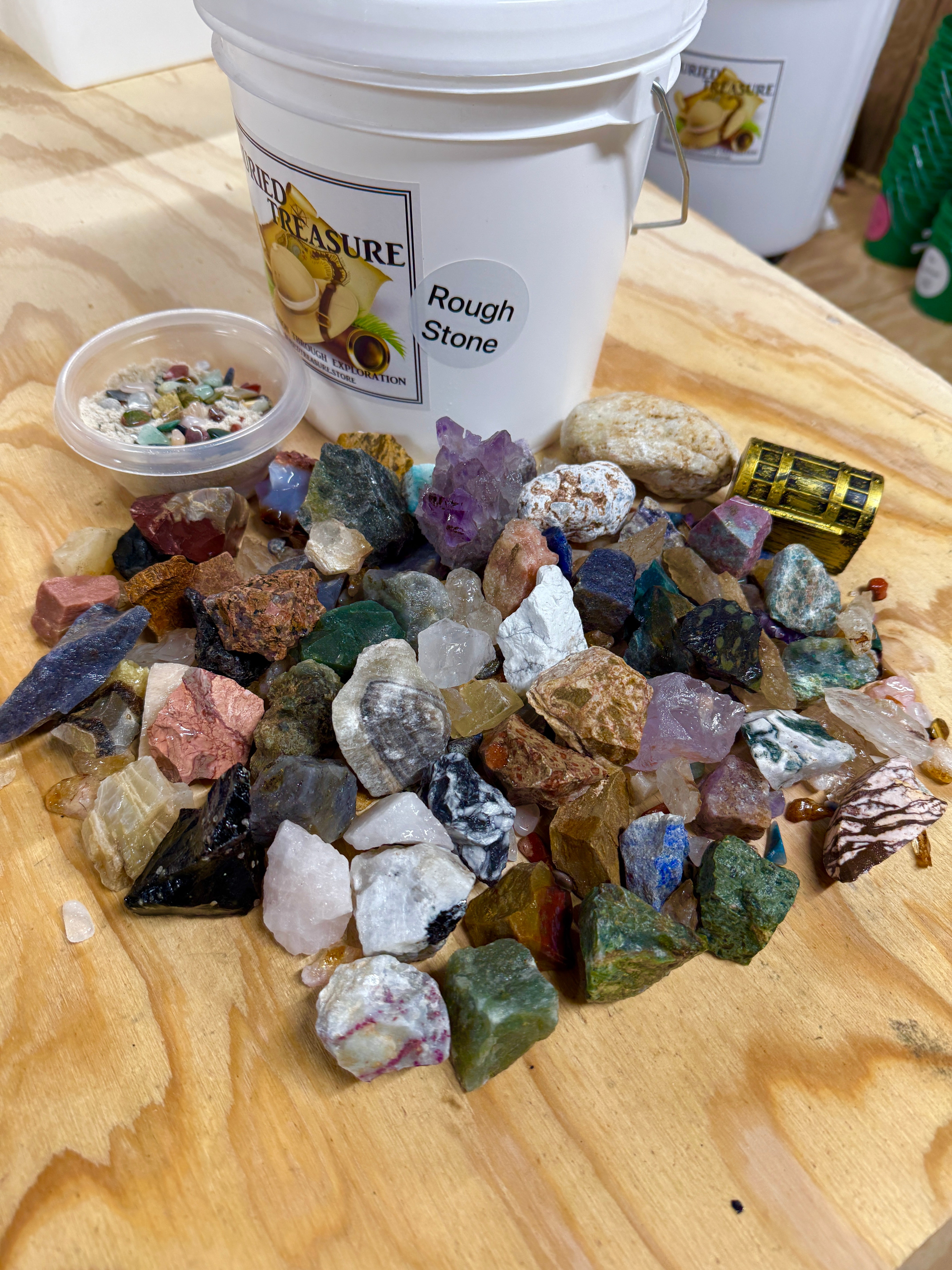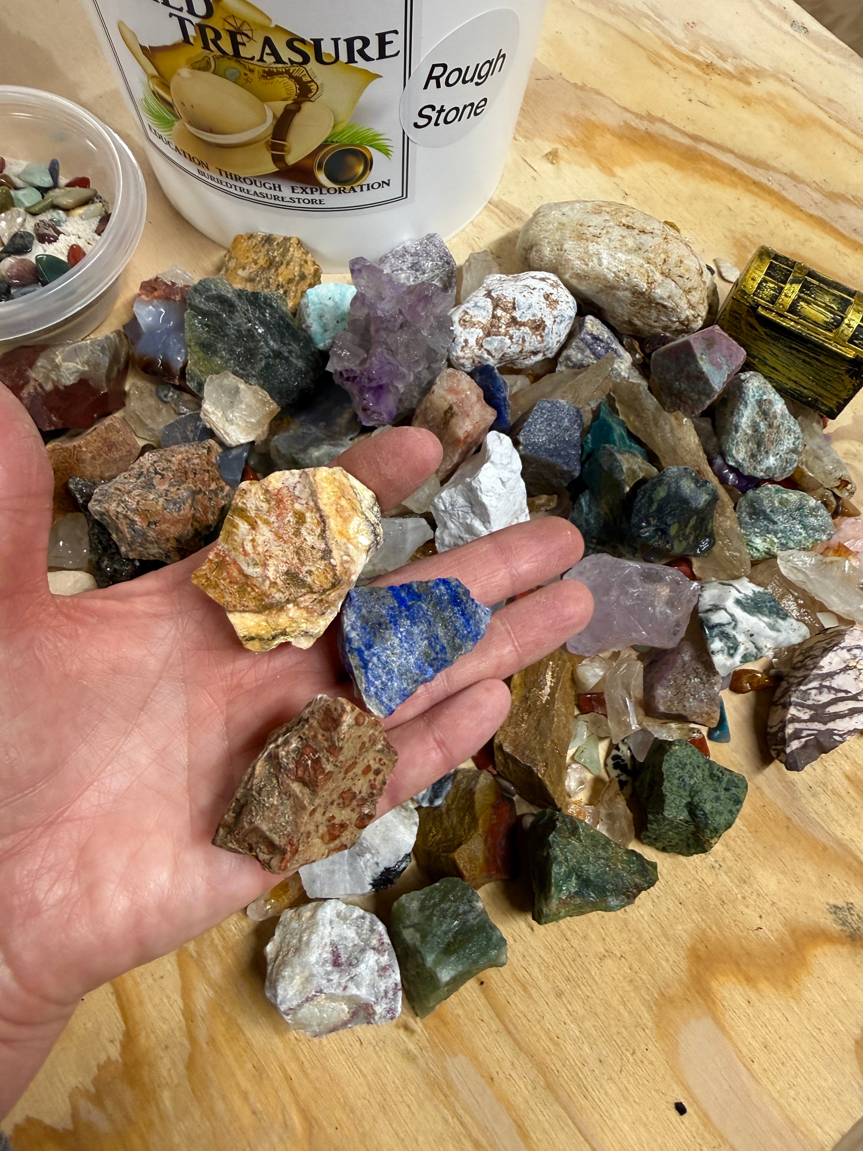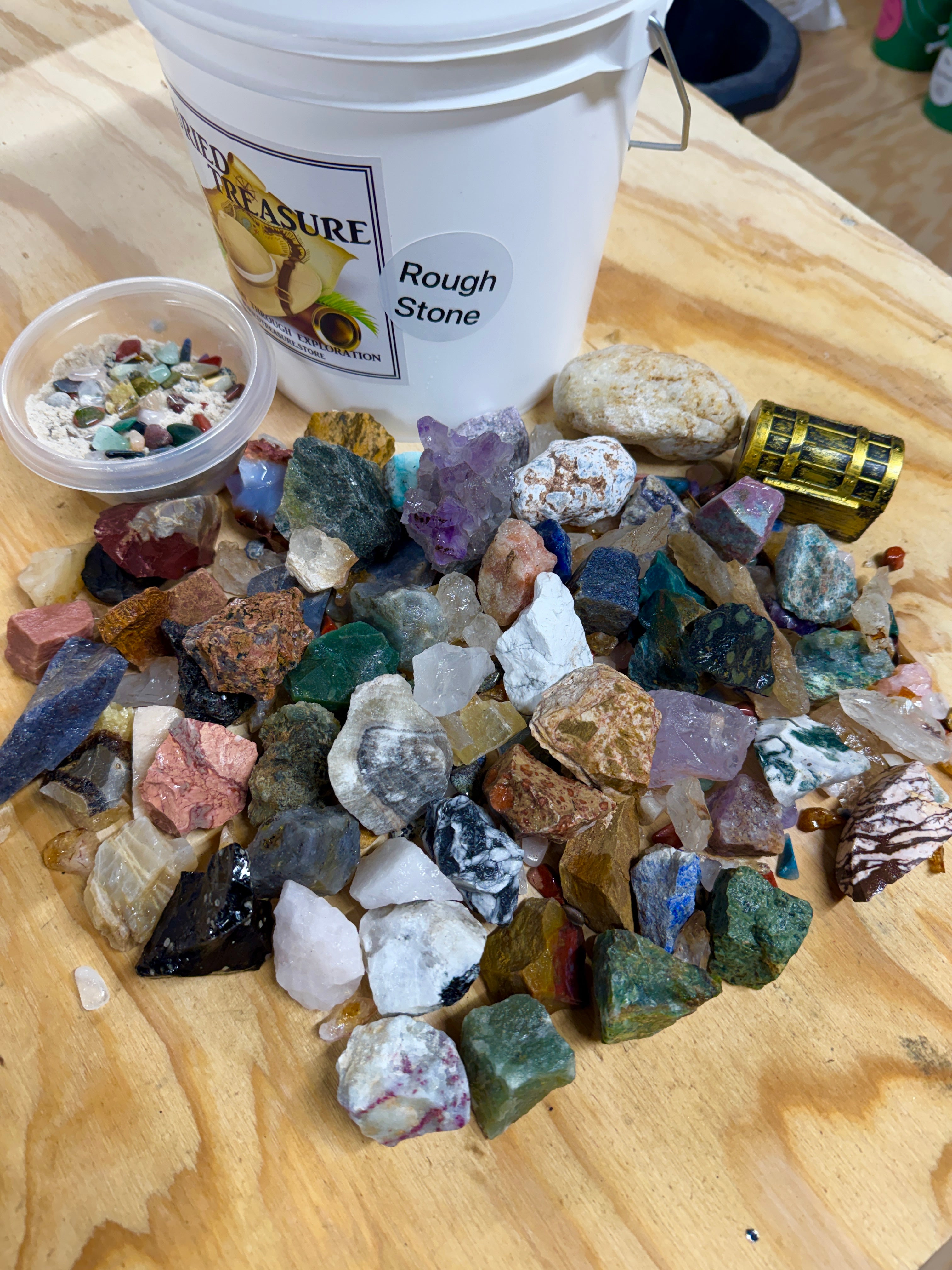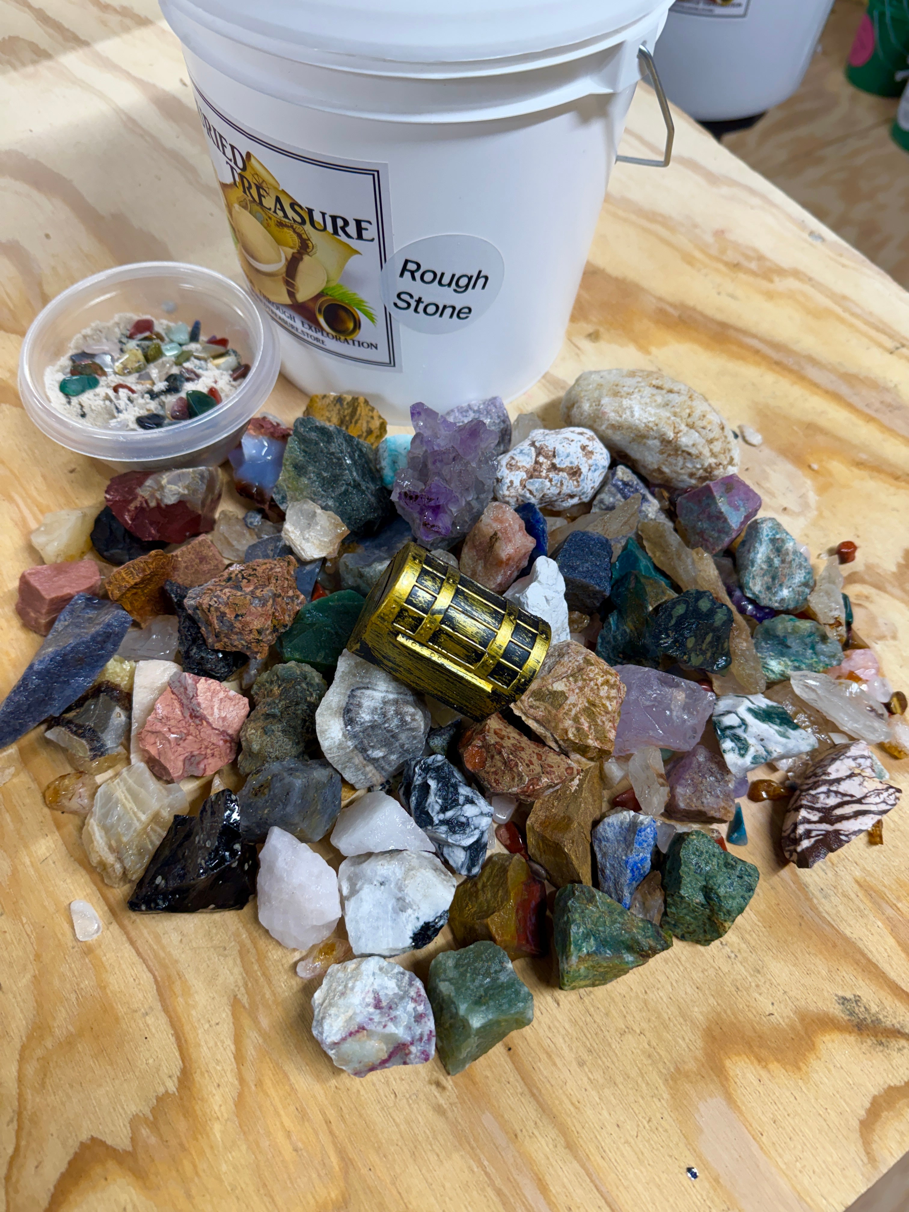 Experience 14 pounds of mining fun with our 1 gallon Rough Stone Mining Bucket. We now fill our buckets with at least one of each stone off our table, between 45 and 55 different rough stones in every bucket, over 5 lbs. Each bucket also comes with a crackable geode and buried treasure. Uncover rare gems and minerals from around the world. Each bucket also comes with our gemfetti sand. Our gemfetti sand is washed and sifted sand that is littered with small tumbled stones. Perfect for hours off screen time, parties, family fun, learning, the aspiring geologist or gem collector.